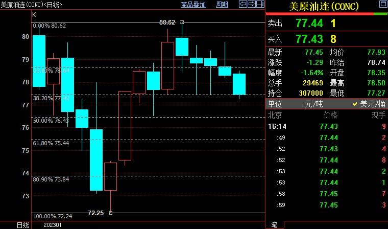 北京时间16:16,NYMEX原油期货下跌1.54%至77.28美元/桶;ICE布伦特原油期货下跌1.42%至83.93美元/桶。两市均创2月9日以来新低,分别至77.27美元/桶和83.70美元/桶。