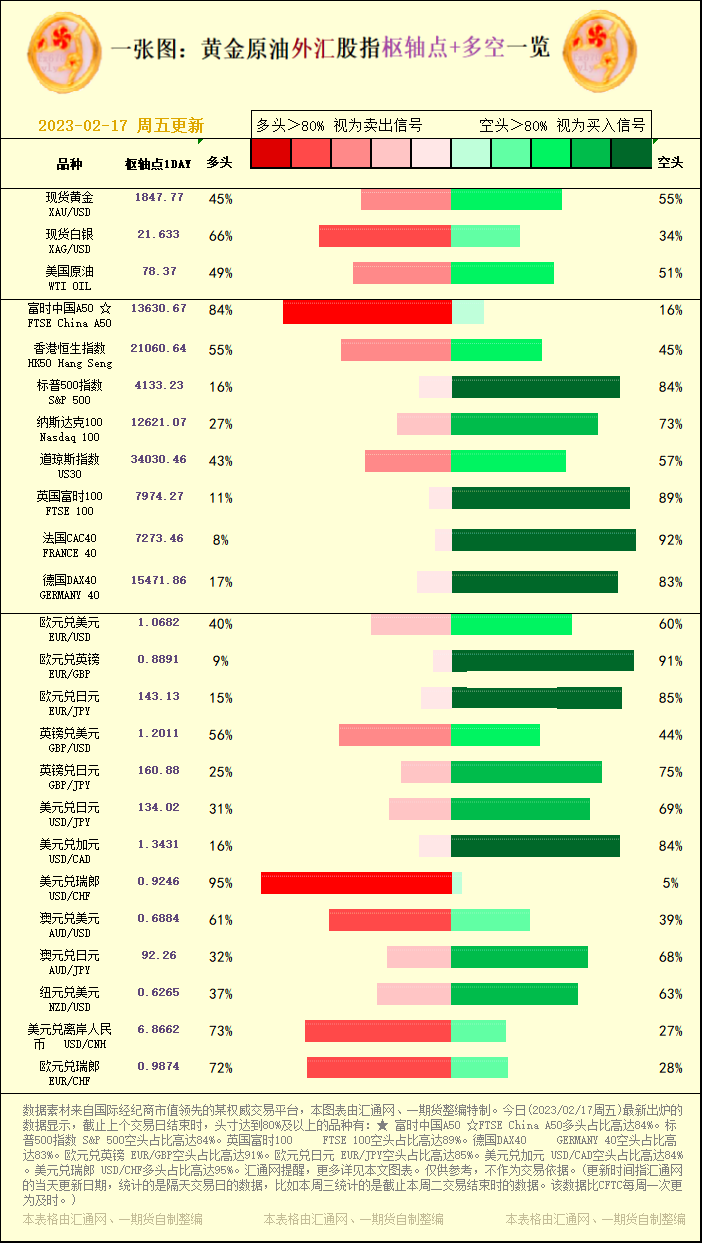 一张图:黄金原油外汇股指"枢纽点+多空占比"一览(2023/02/17周五)