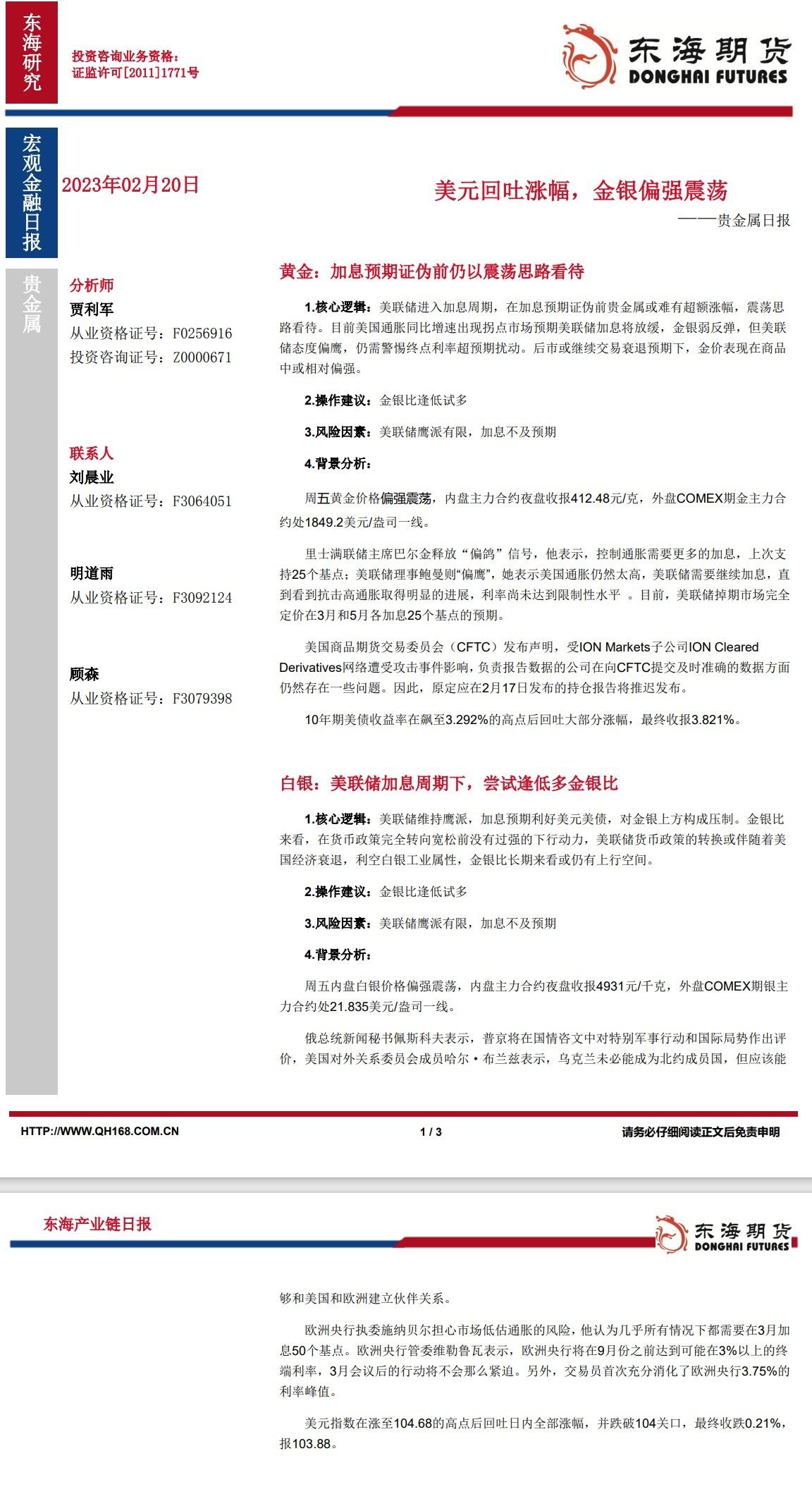 【东海期货2月20日产业链日报】贵金属篇:美元回吐涨幅,金银偏强震荡