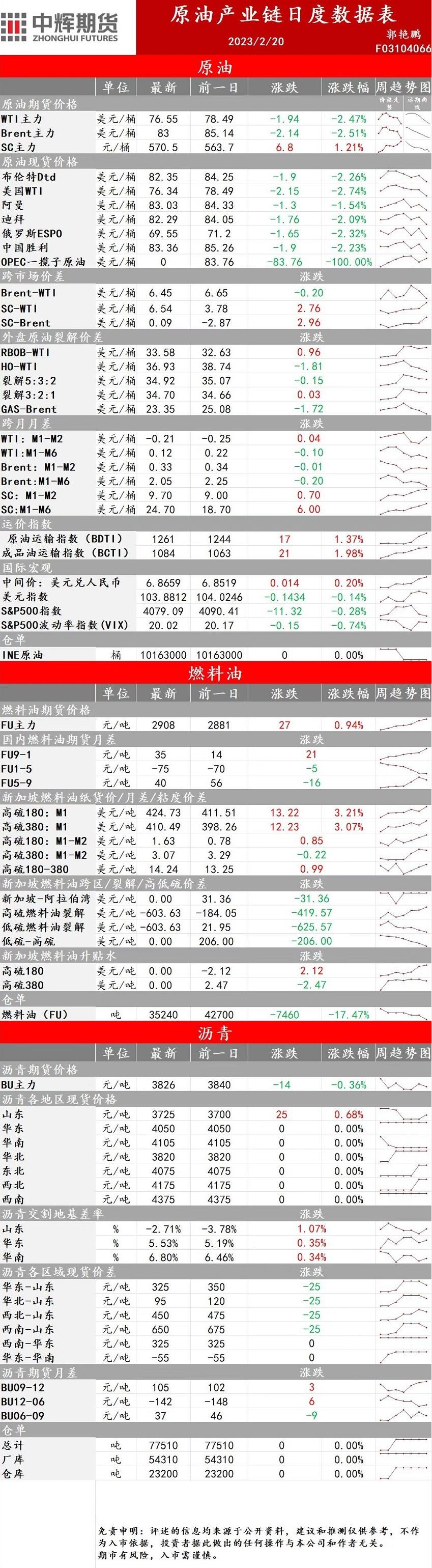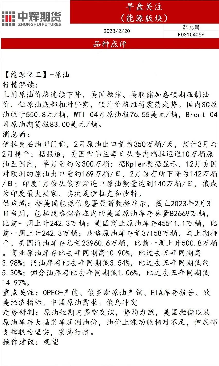 2月20日,中辉期货发布能源早盘关注,称原油上涨动能相对不足,但底部支撑较为坚实,震荡行情,建议观望。