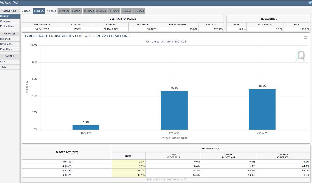 目前市场密切关注,美联储11月2日的利率决定,这将会影响黄金的近期前景。当前市场预计央行将再次加息 75 个基点。