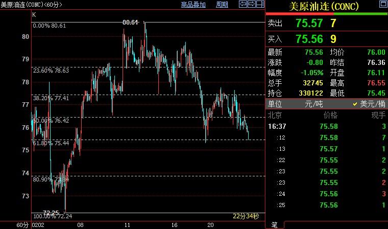 小时图上看,NYMEX原油料重新跌破75.44美元,并进一步下探75美元关口。75.44美元是72.25美元-80.61美元上涨区间的61.8%斐波那契回档位。