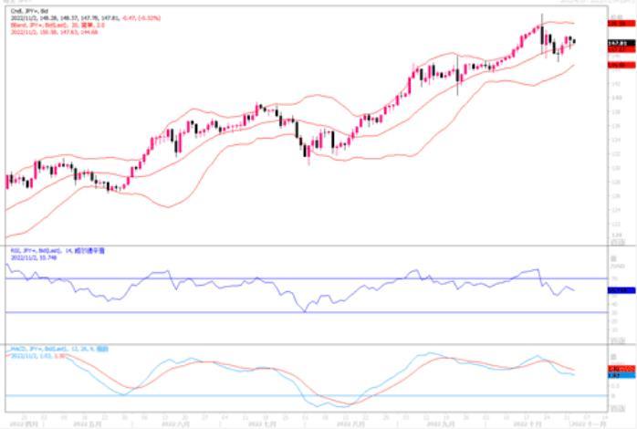 周二传出日本当局有干预行动消息下,美元兑日元出现回落行情,美元/日元在电子交易系统(EBS)上从148.82跌至148.14。但考虑到今天开始美联储召开11月份的议息会议,若美联储仍大幅加息75个基点,则要防范短线出现剧烈波动的风险。技术图形上,4小时图已跌穿短期均线下方,技术指标出现拐头向下的迹象。近期留意布林带中轨线147.50的支撑,若跌破上周低点145.00将成为前进的初步目标。而上方在150.00水平处 ,由于忌惮日本政府干预,恐会成为较为坚强的阻力位置。