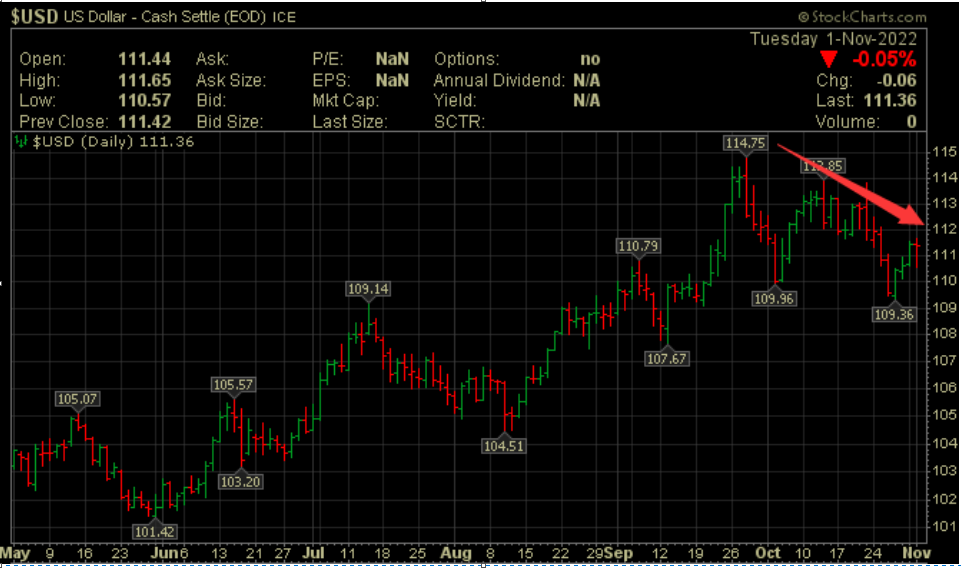 若从9月28日的高点114.78,到10月27日的低点109.53计算,美元指数在这段时期内累计下跌了4.6%,这是自2021年7月以来美元指数从52周高点回落录得的最大跌幅。