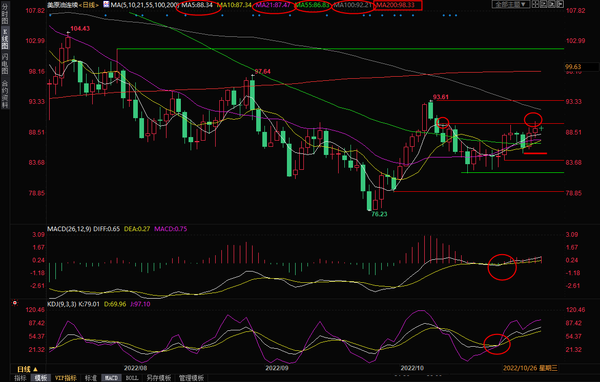 日线级别:震荡;MACD金叉,KDJ金叉,短期均线向上发散并支撑油价,短线略微偏向多头,留意隔夜高点90.46附近阻力,若能顶破该阻力,则油价有望进一步试探100日均线92.21附近阻力,进一步这阻力在10月10日高点93.61附近,200日均线阻力在98.31附近。