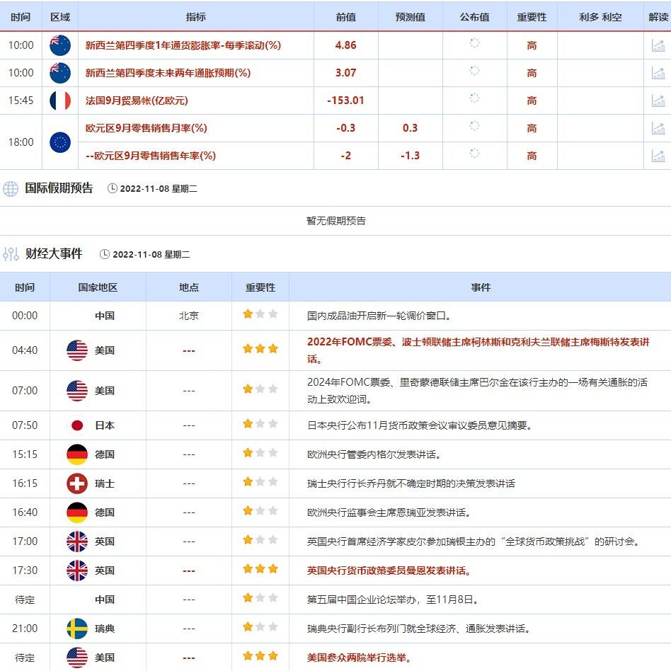 11月8日当天,英国央行货币政策委员曼恩发表讲话。他在11月4日表示:“推动英国通胀走高的动力仍然很强,我们必须承受住物价上涨的压力;利率不必像市场预期的那么高。”投资者需关注他下周讲话释放的最新观点。