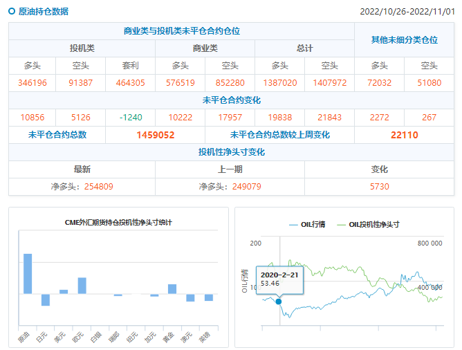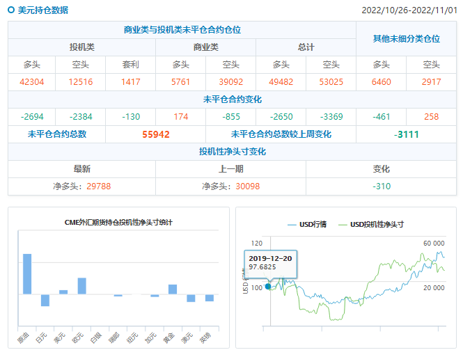 汇通网CFTC持仓数据:截至11月1日当周,美元净多头头寸骤降至30.8亿美元,为2021年8月17日来最低。投机者所持布伦特月WTI原油净多头头寸增加35291手至425866手合约,创最近18周新高。