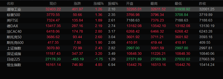美股收盘情况:道琼斯工业指数上涨1.26%,至32403.22点;标普500指数上涨1.36%,至3770.55点;纳斯达克指数上涨1.28%,至10475.25点。