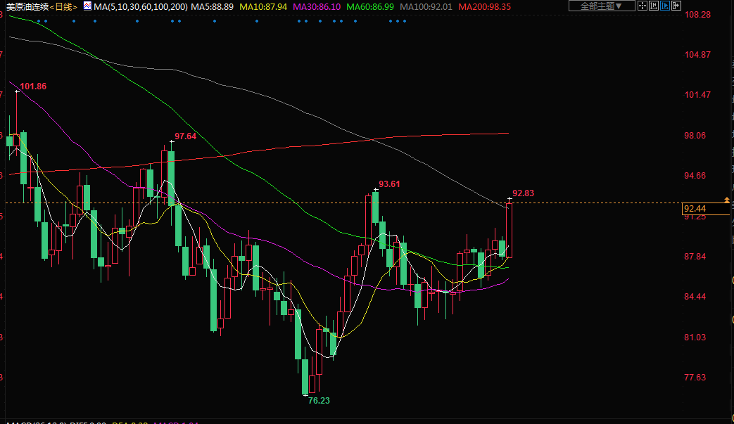 商品收盘情况:布伦特原油期货结算价上涨3.99美元,报每桶98.57美元,周线上涨2.9%。美国原油期货上涨5%,报每桶92.61美元,周线涨幅为4.7%。美国期金结算价上涨2.8%,报每盎司1676.6美元。