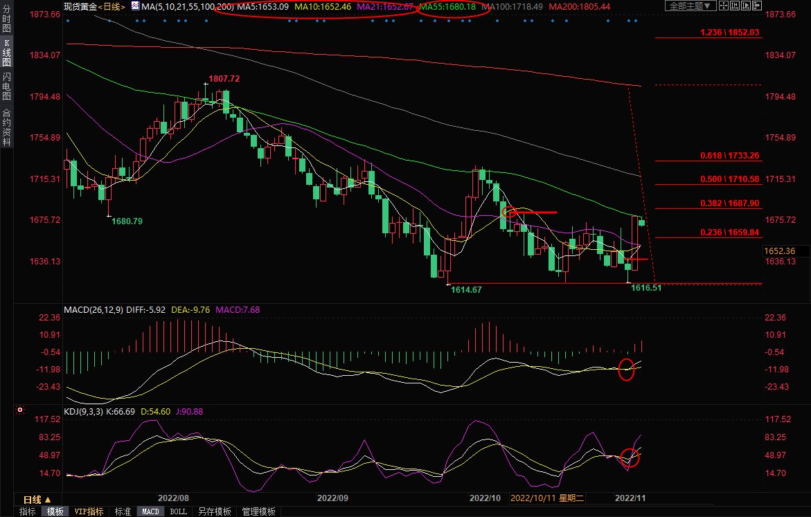 日线级别:震荡;金价多次在1616.5附近获得支撑后,上周五大幅上涨,回升至5日均线、10日均线和21日均线上方,也回到布林线中轨上方,MACD金叉,KDJ金叉,金价初步筑底成功,在失守21日均线1652.73前(5日均线和10日均线支撑都在该位置附近),短线偏向多头;初步阻力在55日均线1680.21附近,1807-1614.67跌势的38.2%回撤位阻力在1687.90附近,1700关口也是重要心理阻力位所在,布林线上轨阻力在1718.73附近,如果金价能够顶破1687.90附近阻力,则有可能进一步涨至该位置附近。
