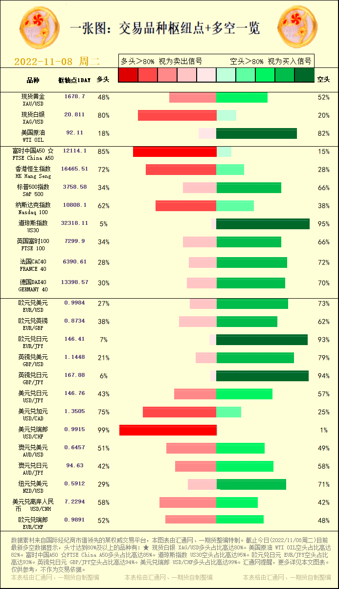 一张图:交易品种枢纽点+多空占比一览。截止今日(2022/11/08周二)目前最新多空数据显示,头寸达到80%及以上的品种有:★ 现货白银 XAG/USD多头占比高达80%。美国原油 WTI OIL空头占比高达82%。富时中国A50 ☆FTSE China A50多头占比高达85%。道琼斯指数 US30空头占比高达95%。欧元兑日元 EUR/JPY空头占比高达93%。英镑兑日元 GBP/JPY空头占比高达94%。美元兑瑞郎 USD/CHF多头占比高达99%。汇通网提醒,更多详见本文图表。仅供参考,不作为交易依据。