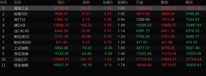 美股收盘情况:标普500指数攀升0.56%,收报3828.13点。纳斯达克指数上涨0.49%,报10616.20点,道琼斯工业指数攀升1.02%,至33160.83点。