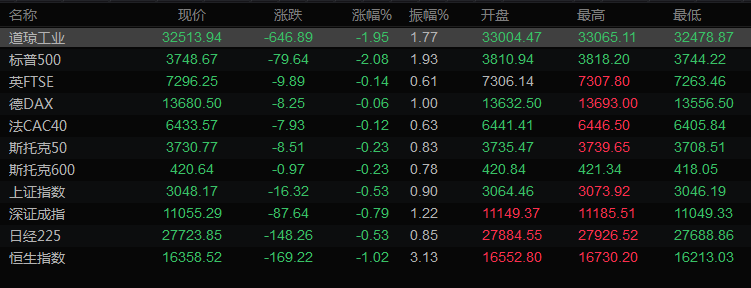 美股收盘情况:标普500指数大跌2.08%,至3748.58点。纳斯达克指数重挫2.48%,至10353.18点;道琼斯工业指数下跌1.95%,至32513.94点。