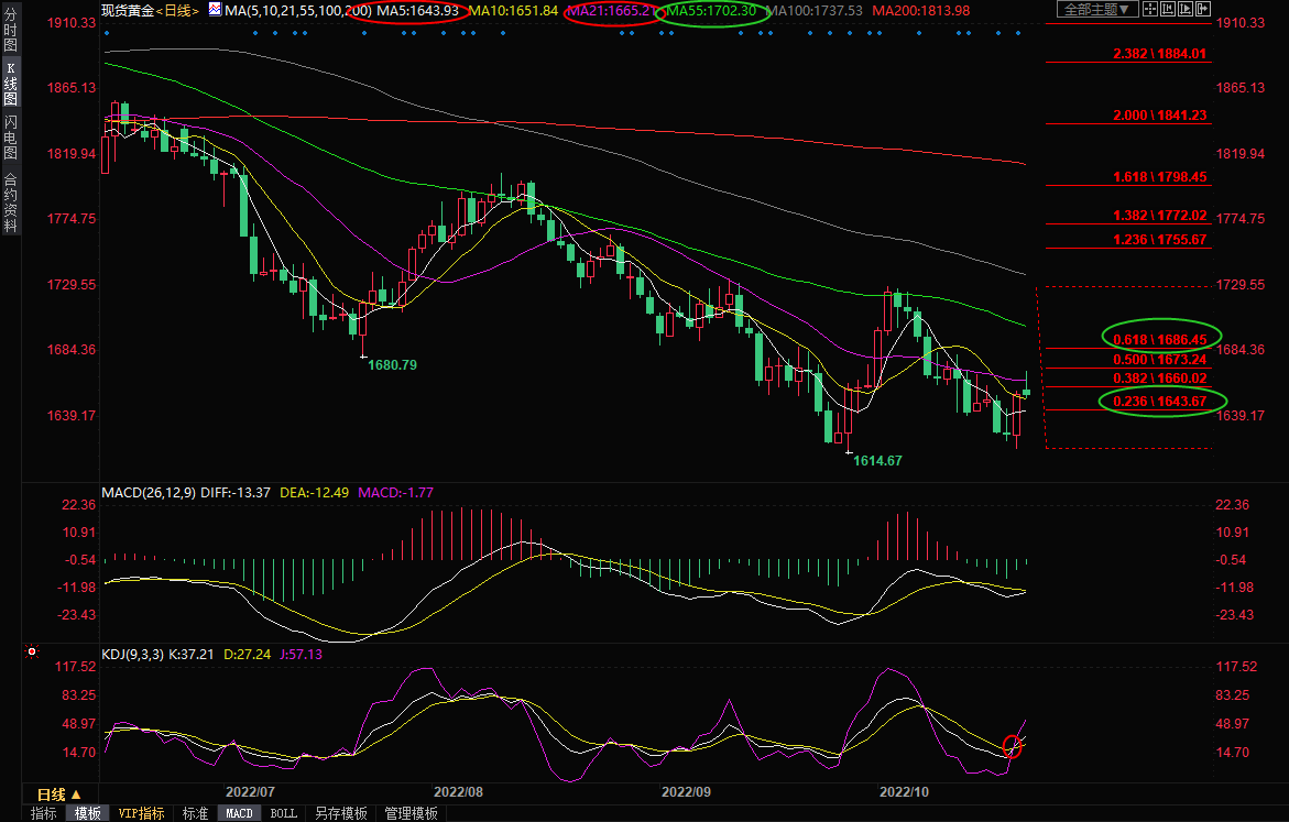 若金价不能顶破1686.45附近阻力,则仍需提防金价重回跌势的可能性;下方初步支撑在1650关口附近,5日均线支撑在1643.91附近,23.6%回撤位也在该位置附近,若回落至该位置下方,则削弱短线看涨信号。