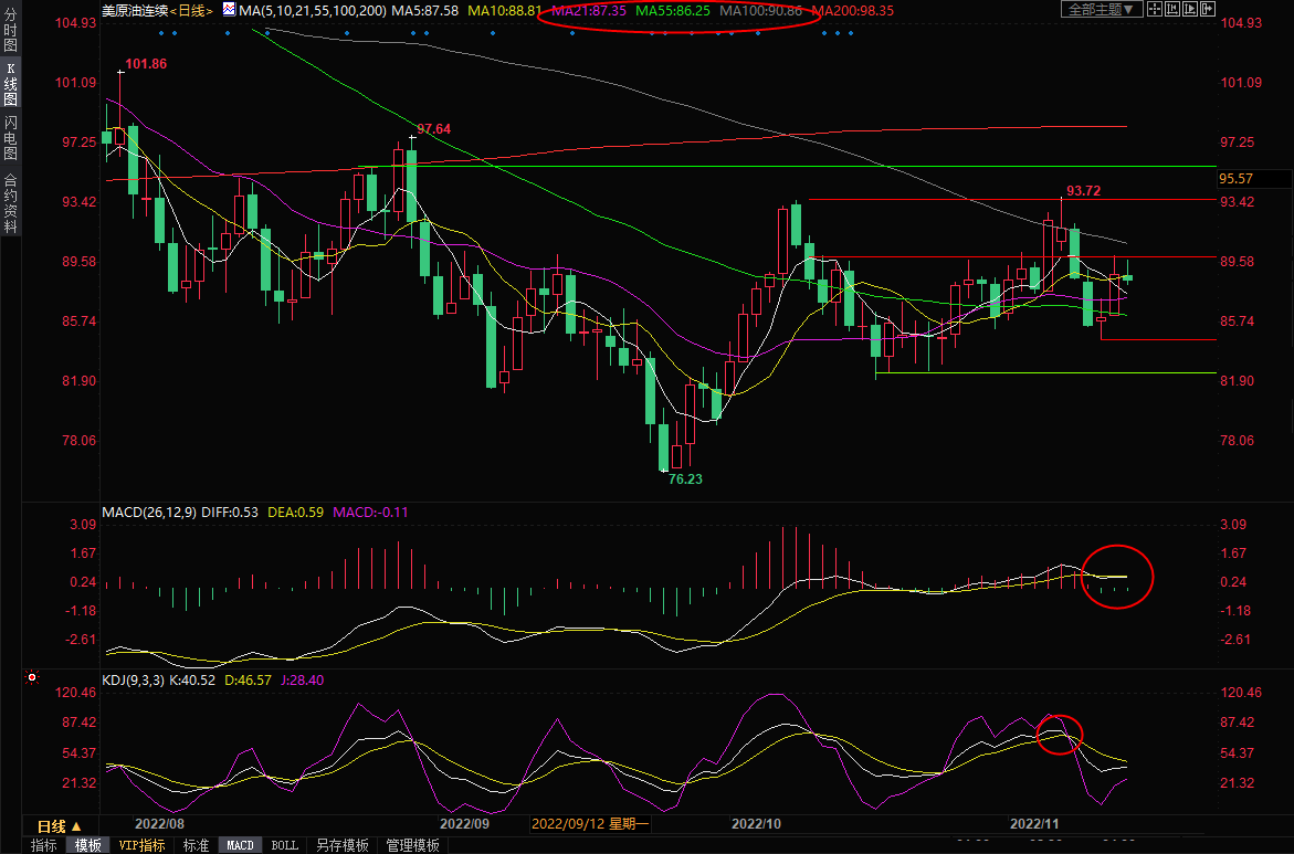 不过,MACD死叉信号减弱,油价仍在布林线中轨上方,如果顶破90关口附近阻力,则有望再度试探布林线上轨92.04附近阻力,100日均线90.86附近阻力也可以简单留意一下。