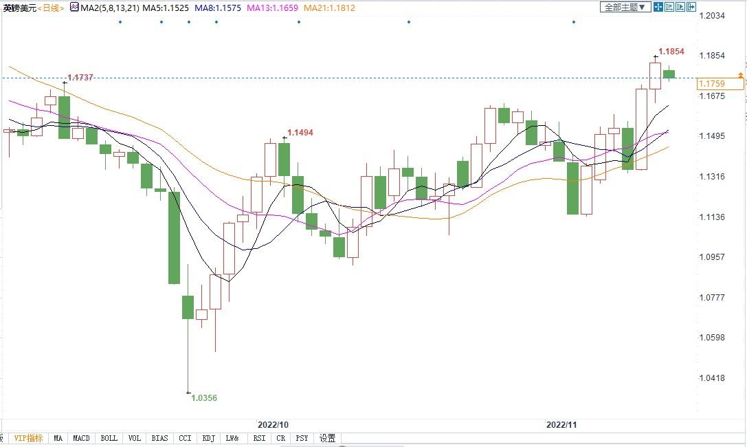 因为上周发布的数据显示,美国10月份通胀低于预期,导致美元创下十多年来最大的日涨幅,英镑兑美元大涨,触及11周高位1.1854,目前高位窄幅震荡。 市场分析师认为,英国财长的行动将导致英国陷入进一步的衰退,这将成为英镑面临的潜在利空,投资者需警惕英镑兑美元高位回落风险。