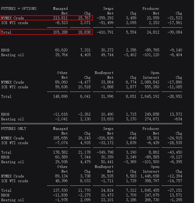 原油方面,美国商品期货交易委员会(CFTC)数据还显示,11月8日当周,投机者所持NYMEX WTI原油净多头头寸增至213811手合约,创最近逾15周新高。投资者在纽约和伦敦的原油综合期货和期权净多头头寸增加 18838 份合约至 205288 份。