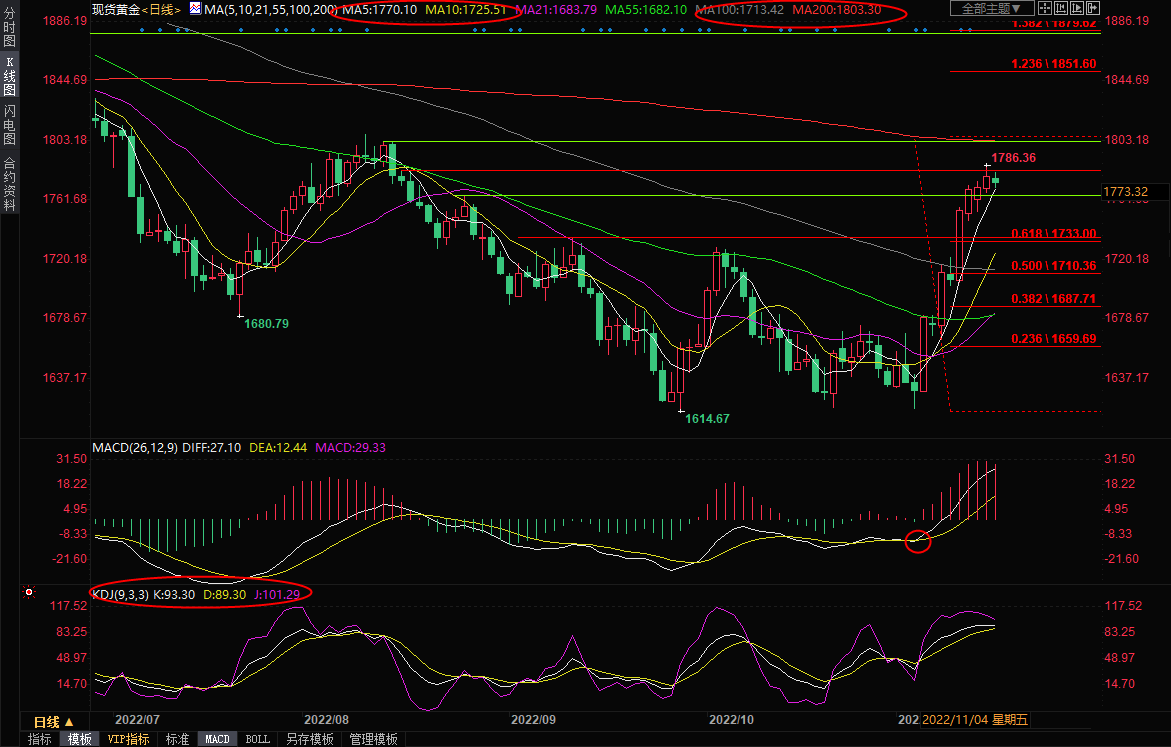 日线级别:震荡上涨;金价在顶破了1807-1615跌势的61.8%回撤位1733附近阻力后延续涨势,MACD金叉良好运行并上穿零轴,布林线开口,金价沿布林线上轨向上运行,后市大概率会重新试探8月10日高点1807.72附近阻力,200日均线1803.30位置也可以参考。
