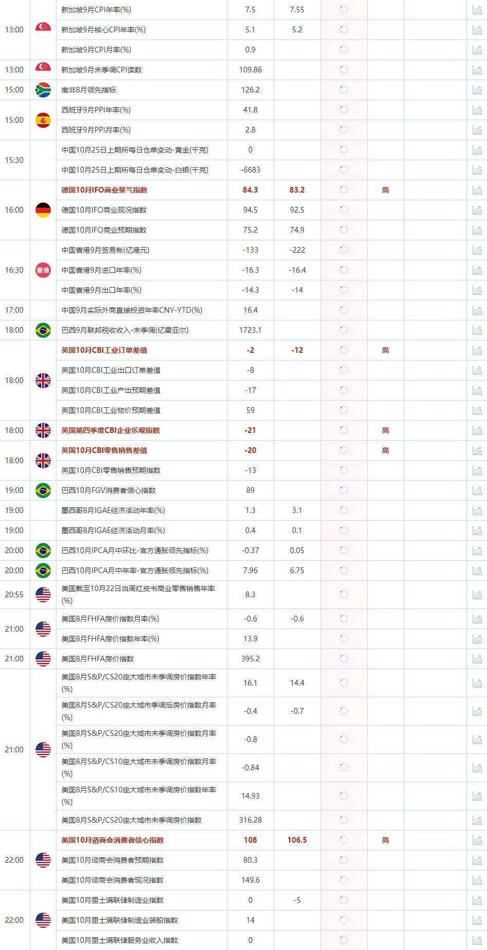 2022年10月25日,全球主要经济体将公布经济数据,需重点关注德国10月IFO商业景气指数,英国10月CBI工业订单差值,英国10月CBI零售销售差值,英国第四季度CBI企业乐观指数和美国10月谘商会消费者信心指数。大事方面需关注:英国央行首席经济学家皮尔发表讲话,欧盟举行能源部长会议。