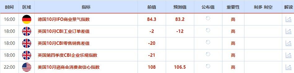 ①英国经纪商Monex Europe称,欧洲央行可能在周四的会议上再次加息75个基点,但欧元的涨幅将有限。Monex Europe的分析师表示,这是因为市场已经消化了75个基点的加息,而欧洲央行没有动机去改变对12月会议加息50个基点的预期。此外,美联储也可能在11月1日-2日的会议上重申其抗击通胀的承诺;
