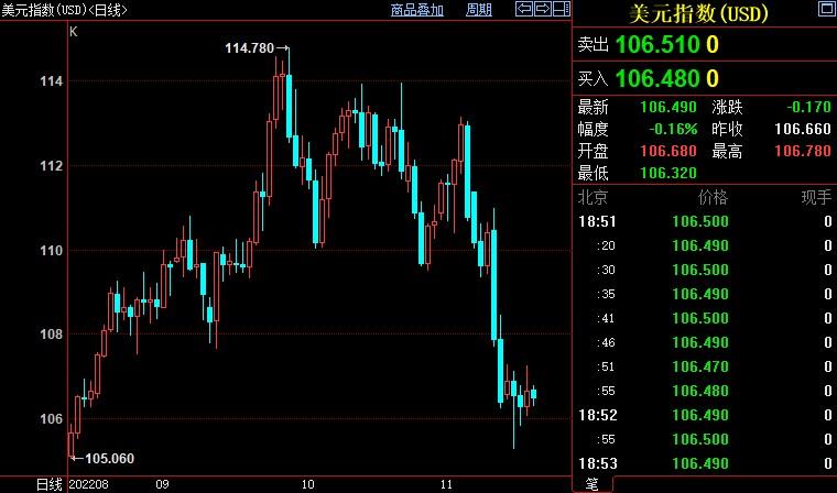 美元指数自盘中创在8月中旬以来低点105.298反弹,微升0.07%至106.497。美国10月零售销售增幅超过预期,表明消费者支出可能有助于支撑第四季度经济,并重新强化美联储继续加息预期。