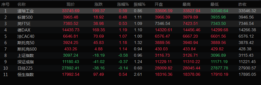 美股收盘情况:道琼斯工业指数上涨0.59%,至33745.69点;标普500指数上涨0.48%,至3965.34点;纳斯达克指数上涨0.01%,至11146.06点。
