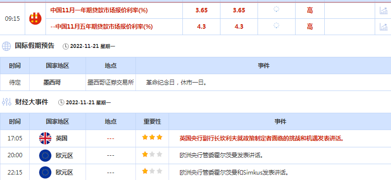 北京时间周一(11月21日),本周迎来新西兰联储公布利率决议和货币政策声明,以及美联储多位官员讲话,和美联储11月会议纪要将发布,投资者将从中寻找美联储加息规模的信息,另外,关注地缘局势和疫情相关消息对油价和金价的影响。
