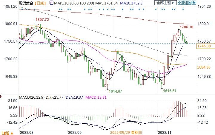 北京时间11月21日13:46,现货黄金报1744.41美元/盎司