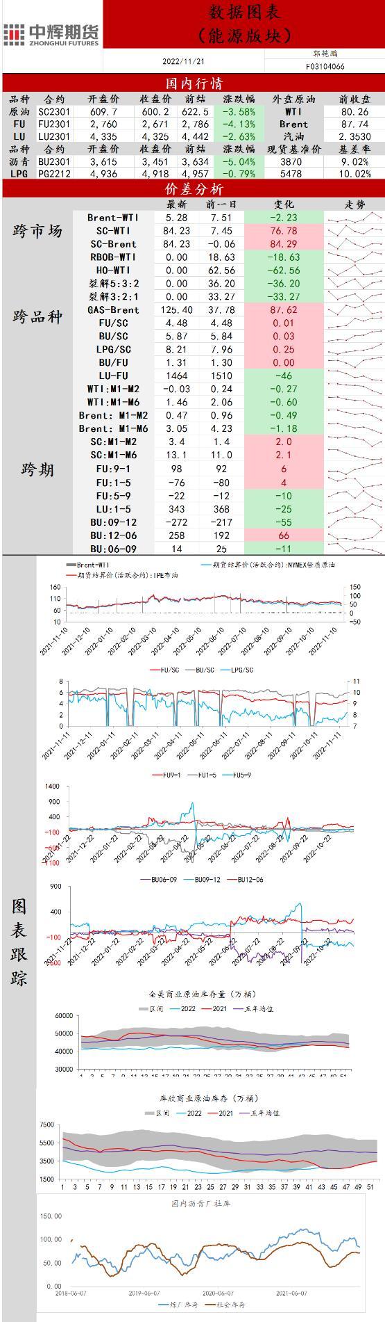 消息面:供需:中国10月原油进口量为4313.6万吨,同比增长14.14%,环比增加7.19%;11月18日,据美国贝克休斯报告显示,美国石油钻机数增加1座至623座,天然气活跃钻机数增加2座至157座。地缘政治:11月18日,欧盟能源政策负责人表示,欧盟预计将在12月5日对俄罗斯原油价格实施上限计划前,及时完成相关的法规。欧盟将从12月5日期,对俄罗斯原油禁运,明年2月5日起禁运俄罗斯原油产品。