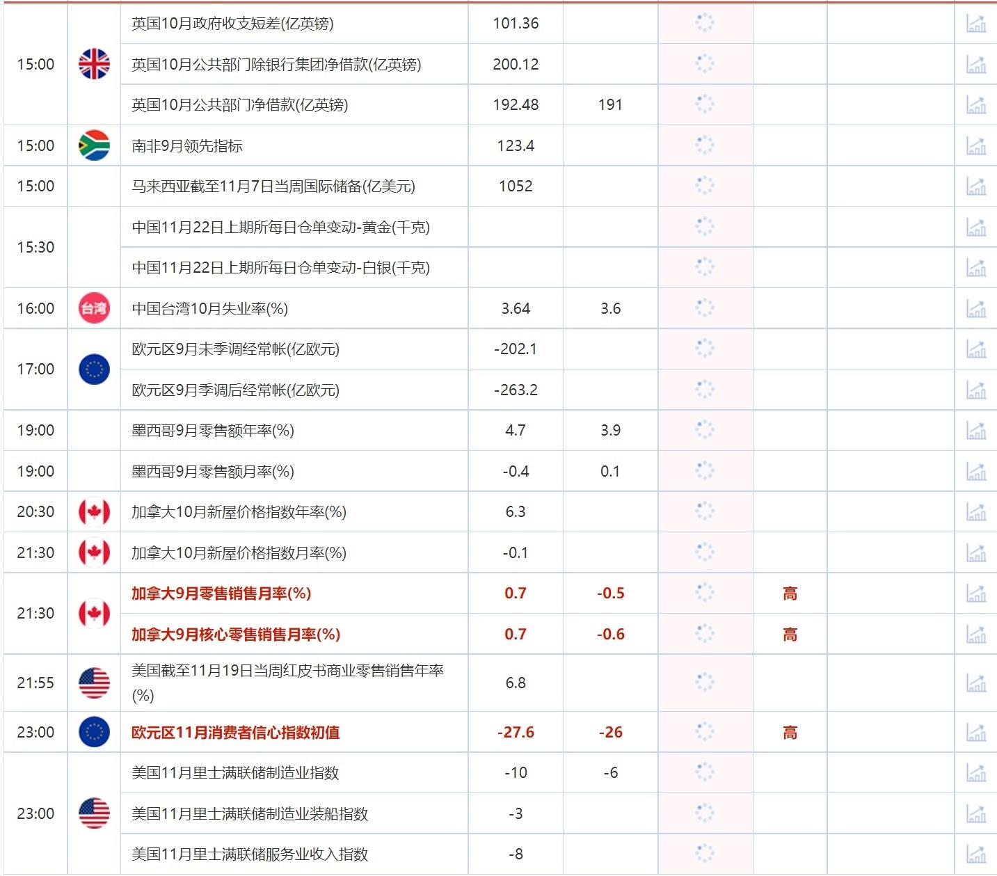 11月22日,投资者需要关注的重点数据:新西兰10月贸易帐,欧元区9月未季调经常帐,欧元区9月季调后经常帐,加拿大9月零售销售月率,加拿大9月核心零售销售月率,欧元区11月消费者信心指数初值和美国11月里士满联储制造业指数。需要关注的大事件包括澳洲联储主席洛威发表讲话,欧洲央行管委霍尔茨曼和雷恩发表讲话。