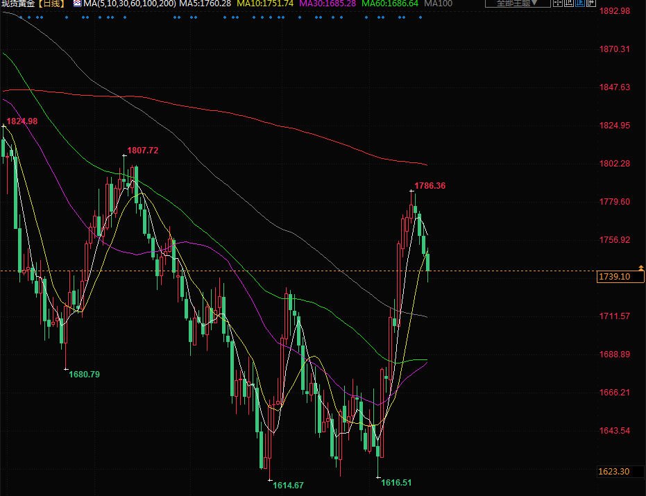 现货金下跌0.7%,至每盎司1,738.40美元,此前曾触及11月10日以来最低1731.40美元。