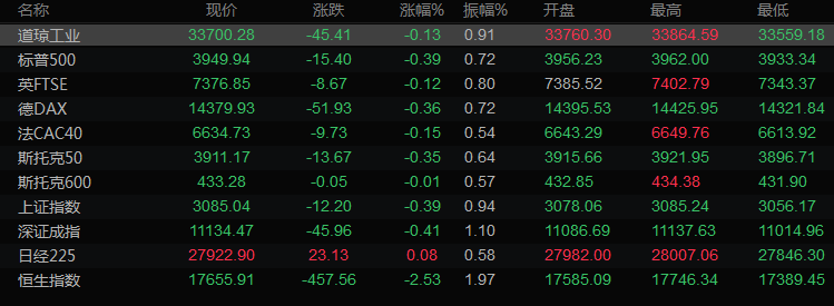 美股收盘情况:道琼斯工业指数下跌0.13%,至33700.28点;标普500指数.SPX下跌0.39%,至3949.94点;纳斯达克指数下跌1.09%,至11024.51点。
