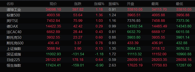 美股收盘情况:道琼斯工业指数上涨1.18%,至34098.1点;标普500指数上涨1.36%,至4003.58点;纳斯达克指数上涨1.36%,至11174.41点。
