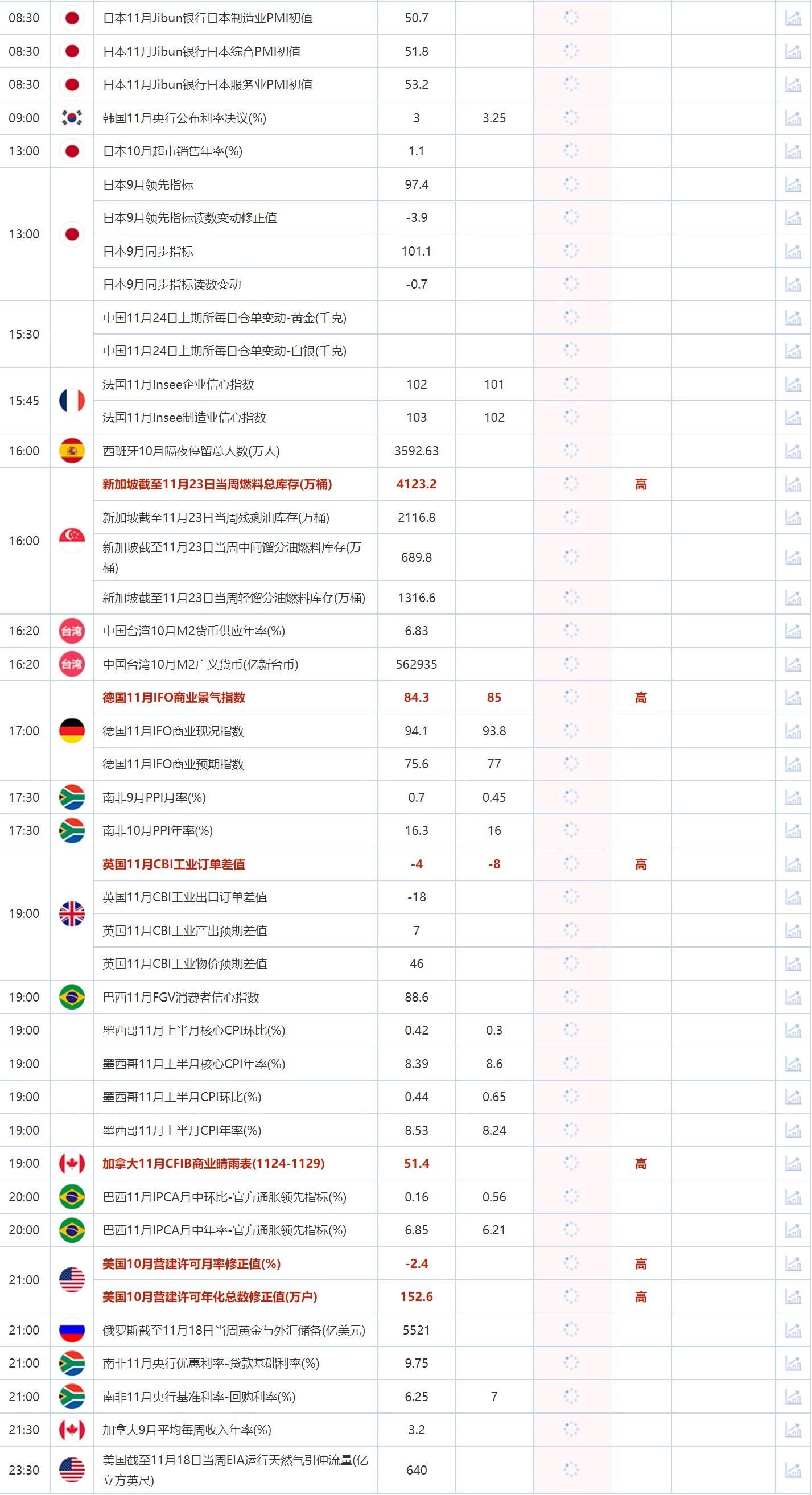 11月24日,投资者需要关注的重点数据:美国截至11月24日当周全美钻井总数 ,美国截至11月24日当周石油钻井总数 , 韩国10月PPI年率 , 新加坡截至11月23日当周燃料总库存,德国11月IFO商业景气指数和英国11月CBI工业订单差值。需要关注的大事件包括 韩国央行公布利率决议,欧洲央行副行长金多斯发表讲话,欧盟能源部长举行紧急会议。