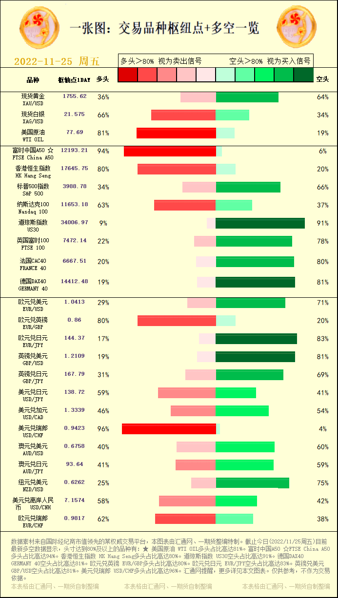 一张图:交易品种枢纽点+多空占比一览。截止今日(2022/11/25周五)目前最新多空数据显示,头寸达到80%及以上的品种有:★ 美国原油 WTI OIL多头占比高达81%。富时中国A50 ☆FTSE China A50多头占比高达94%。香港恒生指数 HK Hang Seng多头占比高达80%。道琼斯指数 US30空头占比高达91%。德国DAX40 GERMANY 40空头占比高达81%。欧元兑英镑 EUR/GBP多头占比高达80%。欧元兑日元 EUR/JPY空头占比高达83%。英镑兑美元 GBP/USD空头占比高达81%。美元兑瑞郎 USD/CHF多头占比高达96%。汇通网提醒,更多详见本文图表。仅供参考,不作为交易依据。