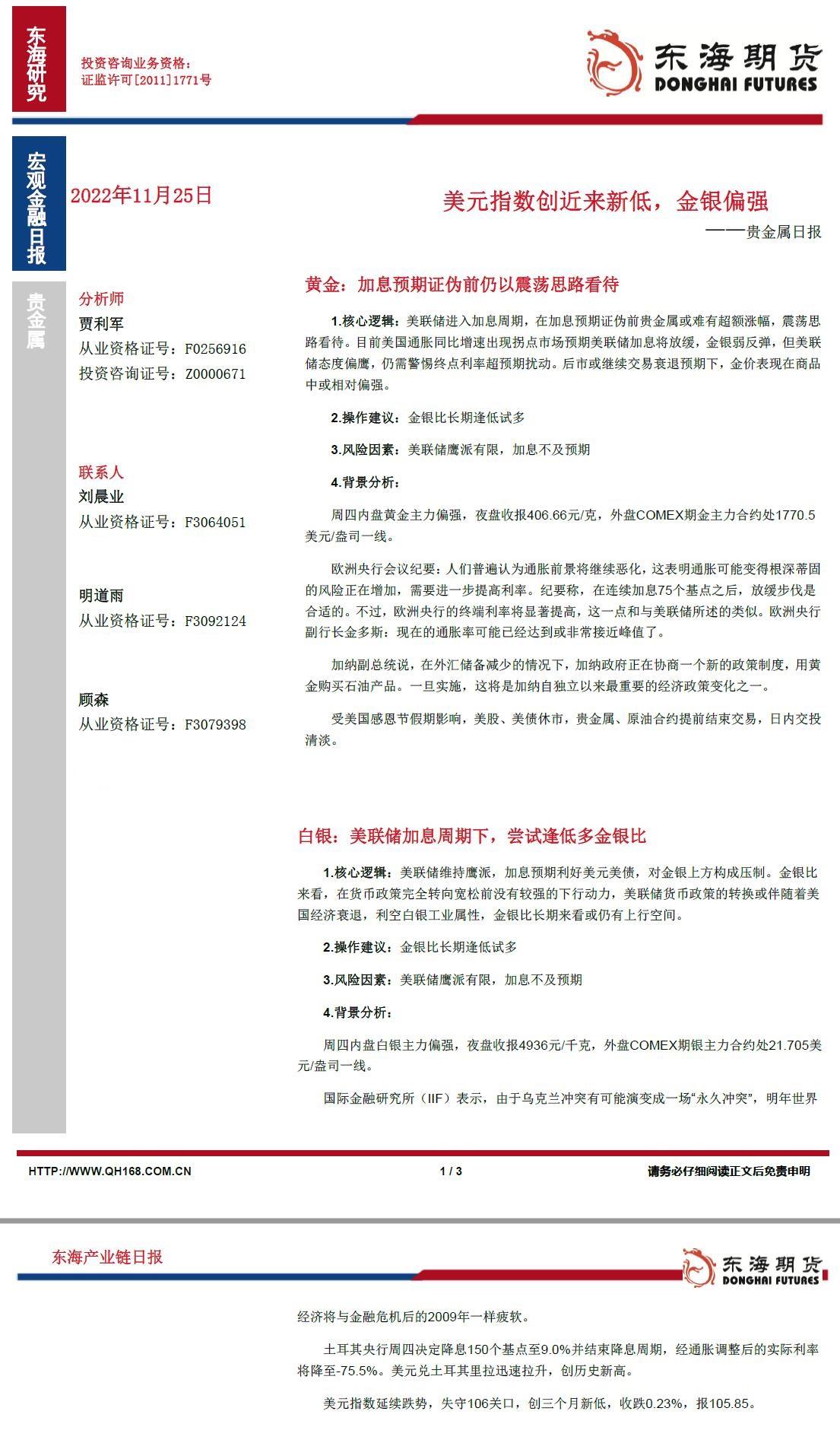 【东海期货11月25日产业链日报】贵金属篇:美元指数创近来新低,金银偏强
