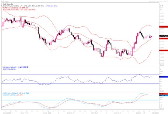 周四02:30,美联储主席鲍威尔将就美国经济前景和就业市场发表讲话。在美联储连续四次加息75个基点之后,鲍威尔的讲话或对美联储是否在12月将基准利率提高50个基点或更高的市场预期做出回应。对此,黄金也暂时进入了横盘整理中。就在周二,美国公布11月咨商会消费者信心指数录得100.2,高于市场预期100,前值为102.5,11月消费者信心再次下降,极有可能是由于最近汽油价格上涨,现状指数进一步放缓,并继续表明,随着今年的结束,经济已失去动力。消费者对短期前景的预期依然悲观。事实上,预期指数低于80,这表明经济衰退的可能性仍然很高。通胀预期上升至自7月以来的最高水平,汽油和食品价格是罪魁祸首。但购买房屋、汽车和高价家电的意愿都冷却了。通货膨胀和加息的双重影响将继续对信心和经济增长构成挑战,直至2023年初。巴克莱分析称,预计美联储的首次降息将在2023年11月到来。该行解释称,鉴于近期公布的数据强于预期,预计短期内GDP会表现较强,衰退开始的时间将比此前的预测晚一个季度来临。巴克莱现在预计美联储将在明年5月至9月维持利率不变,然后在11月和12月的政策会议上各降息25基点。据CME“美联储观察”:美联储12月加息50个基点至4.25%-4.50%区间的概率为67.5%,加息75个基点的概率为32.5%;到明年2月累计加息75个基点的概率为32.3%,累计加息100个基点的概率为50.7%,累计加息125个基点的概率为16.9%。也可以看到,尽管美联储在加息方面仍保持鹰调,但外界权威机构则纷纷预测美元利率的上调行将走至末路。为此,作为无息资产的黄金近期表现也是颇为顽强,坚守1700水位之上,并有继续攀高的倾向。