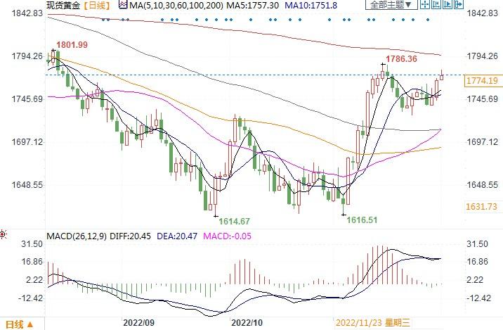 北京时间12月1日11:15,现货黄金报1774.19美元/盎司