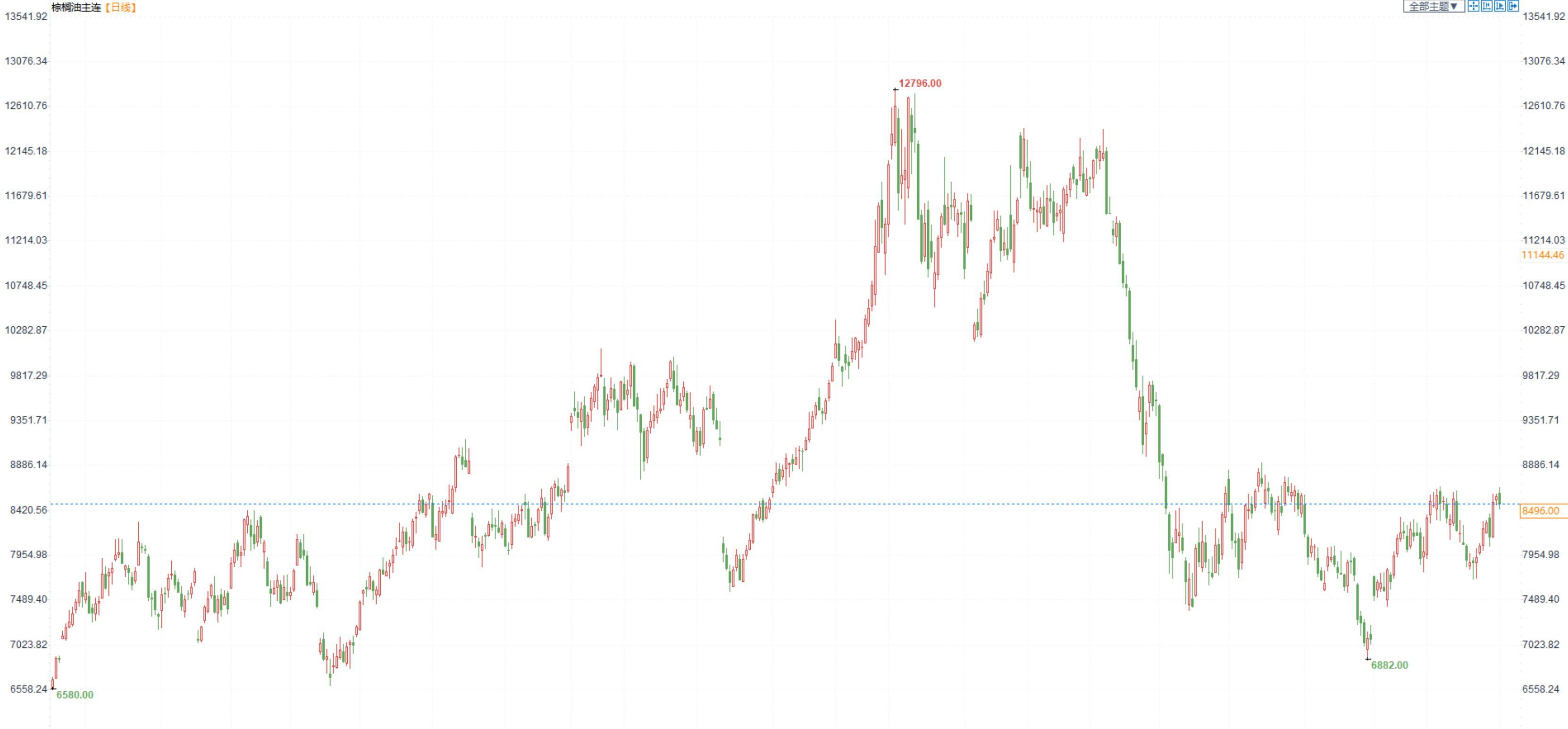 棕榈油2301合约日内跌0.45%,收盘8496元/吨;广州市场棕榈油8660元/吨。