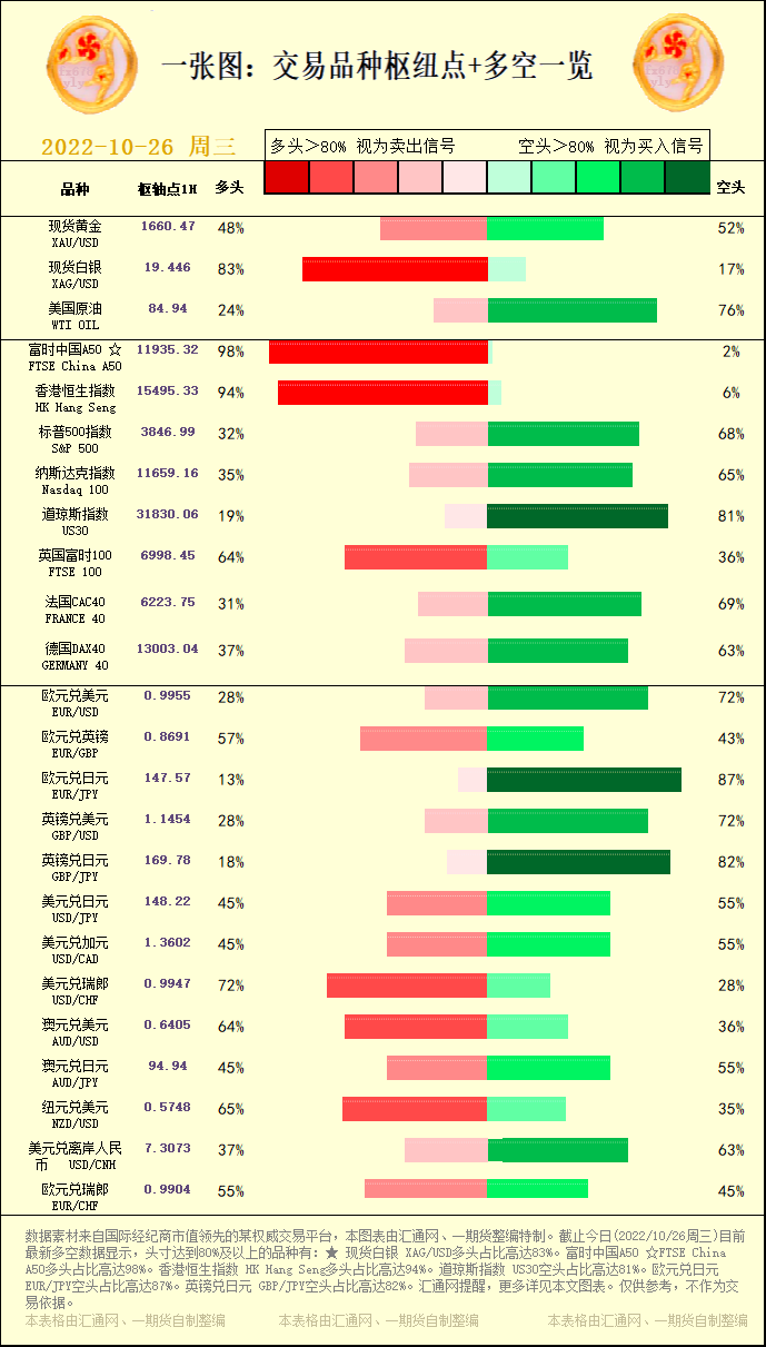一张图:交易品种枢纽点+多空占比一览(2022/10/26周三)。截止今日(2022/10/26周三)目前最新多空数据显示,头寸达到80%及以上的品种有:★ 现货白银 XAG/USD多头占比高达83%。富时中国A50 ☆FTSE China A50多头占比高达98%。香港恒生指数 HK Hang Seng多头占比高达94%。道琼斯指数 US30空头占比高达81%。欧元兑日元 EUR/JPY空头占比高达87%。英镑兑日元 GBP/JPY空头占比高达82%。汇通网提醒,更多详见本文图表。仅供参考,不作为交易依据。