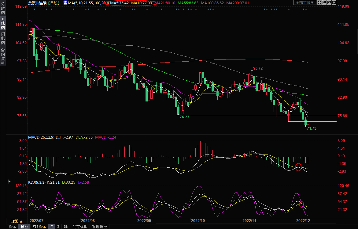 由于短线油价跌幅过大,也需要提防短线超跌反弹调整的可能性。11月28日低点阻力在73.58附近,5日均线阻力在75.42附近,若能快速收复该位置,则增加短线进一步回调的可能性;10日均线阻力目前在77.09附近。