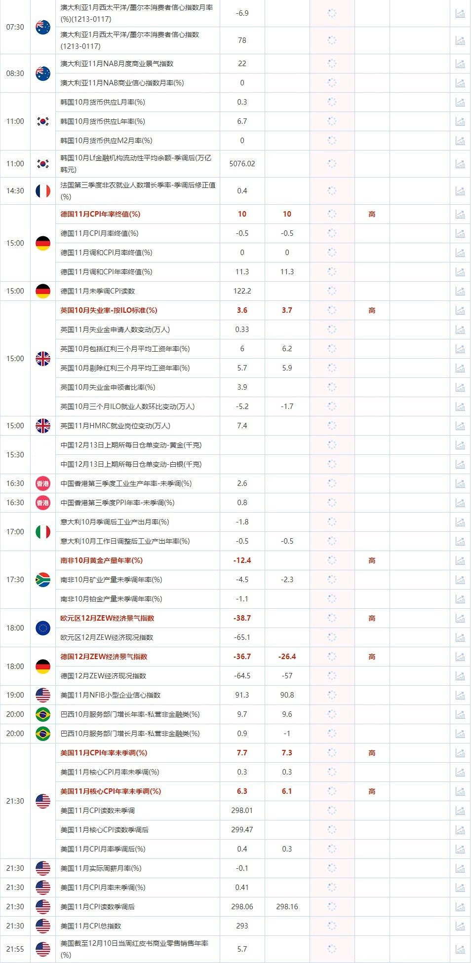 21:30 美国11月核心CPI年率未季调(%) , 前值 6.3 , 预期值 6.1 , 公布值:待发布